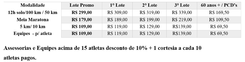 Em um circuito desafiador e inspirador, essa prova reúne modalidades para todos os perfis de atletas: 12 Horas Solo, 100 km, 50 km, 21 km (Meia Maratona), 10 km, 5 km e o revezamento de 12 horas em equipes mistas, femininas ou masculinas.